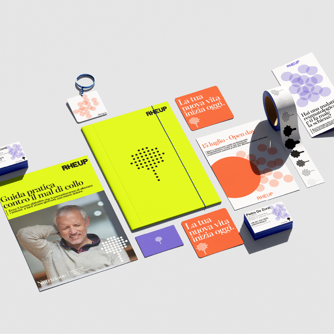 Una brand identity flessibile, che si adatta alle persone. L’identità visiva di Rehup è stata progettata per essere modulare e dinamica, in grado di comunicare con coerenza sia nel contesto medico che in quello comunicativo e divulgativo. Il risultato è un sistema grafico che unisce pulizia formale e accoglienza, in equilibrio perfetto tra rigore scientifico ed empatia.